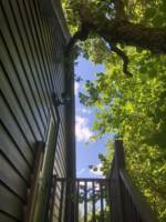 The treehouse-style first-floor entrance opens into a spacious, beautifully designed studio with a living room and dining/work area. You'll find ample sleeping space for four guests, with a sumptuous four-poster bed and a comfy double sofa bed with Egyptian cotton bed linen. There's a marble-tiled bathroom with a double-ended bath and rainwater shower with waterfall taps, and guests are treated to fluffy towels and bath robes. Downstairs, a fully-equipped kitchen includes a cooker, fridge, Nespresso coffee machine, washer/dryer, plus a stock of tea, coffee, milk, biscuits, and other basics. Enjoy the views of the woods while sitting at the breakfast bar.