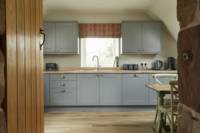 An 'upside-down' property, with the living space on the upper floor and the bedrooms down below, The Old Barn has two double bedrooms and a single room that can be converted to a double with a guest bed. Above here, there's a lovely open-plan, oak beamed living space with a spacious kitchen-dining area which has a superb electric range cooker, dishwasher, Nespresso machine and a dining table with space for 6 people. On the other side of the space, squashy sofas and comfy chairs gather around a large fireplace with a wood-burning stove, while downstairs there's a large and secluded garden with an alfresco dining and barbecue area.